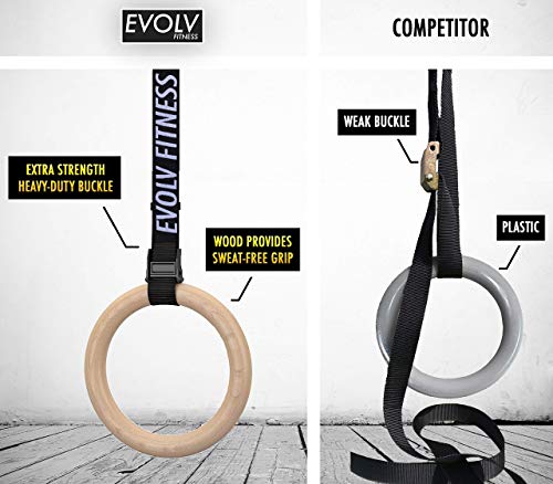 Evolv Fitness Wooden Gymnastics Rings Adjustable Straps Gymnastic Rings Bonus E Book Heavy Duty Olympic Competition Bodyweight Trainer Elite